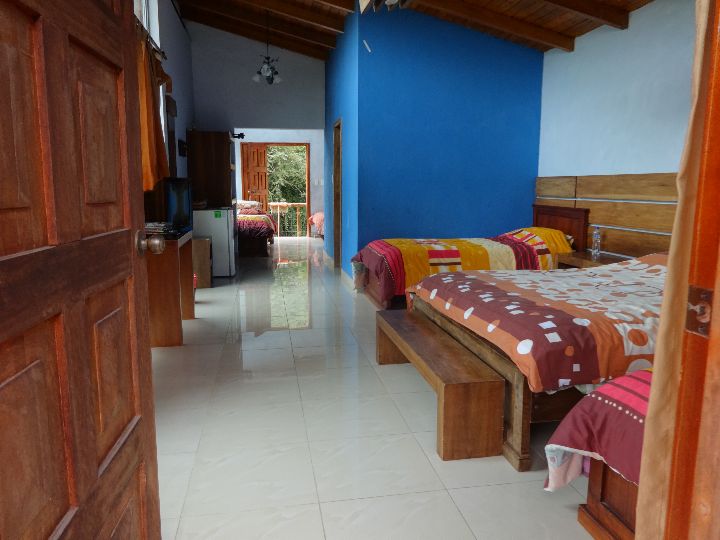 Amplia Habitación Familiar Capacidad para 8 personas. Dispone de 3 cómodas camas de 2 plazas y 3 camas de plaza y media, Alimentación incluye tres comidas, desayuno almuerzo y cena. Piscinas de Aguas Termales cuarenta grados de temperatura, Senderismo por nuestro bosque nativo, Cabalgatas familiares, el costo es de 50 usd por persona adulta niños de 4 años a 12 años el 50% , * estamos a solo 30 minutos de Ibarra y 15 minutos de Salinas, ideal para estadía por compras en Ipiales, en el Noroccidente de Imbabura. * Opcional solo hospedaje. Se acepta mascotas. ***PREVIA RESERVA***