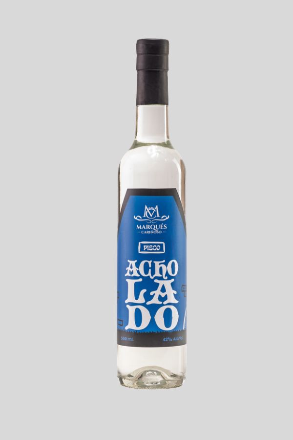 Nombre de Producto: Pisco Marqués Cariñoso, Acholado Bodega: Marqués Cariñoso, Tacna Tipo de Pisco: Acholado Variedad de Uva: 50% Negra Criolla / 50% Italia Presentación: Botella transparente, 500 ml Graduación Alcohólica: 42% ABV Tiempo de Reposo: 6 meses Características Organolépticas y Maridaje En Vista: Brillante, transparente e incoloro. En Nariz: Aromas a frutos frescos, delicados cítricos, pasas, manzana acompañado de notas florales intensas (flor de azahar, jazmín), uva fresca, miel, frutas blancas y un sutil fondo de frutos secos como pasas y pecana, También notas herbales como heno seco. En Boca: Equilibrio muy bien logrado entre lo frutal y lo seco. Final elegante, ligeramente cálido, con retrogusto floral y frutal. Maridaje: Cheesecake de uvas al horno (blancas y negras), cremoso de vainilla con crocante de almendras y miel de azahar: flan de coco con ralladura de lima y caramelo claro; crumble de duraznos con especias suaves y cardamomo; bizcocho de azahar y almendras con glasé de mandarina.