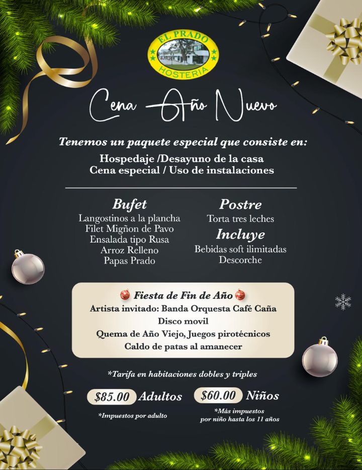 Cena de Año Nuevo 2026 Tenemos un Paquete especial que consiste en: * Hospedaje Desayuno de la Casa * Cena especial * Uso de Instalaciones Bufet Langostinos a la Plancha Filet Miñon de Pavo Ensalada tipo Arroz Relleno Papas Prado Postre Torta tres leches Incluye Bebidas soft ilimitadas Descorche Fiesta de Fin Año Artista invitado Banda Orquesta Café Caña Disco movil Quema de Año Viejo Juegos Pirotécnicos Caldo de Patas al amanecer Tarifa en Habitaciones dobles y triples 85$ Adultos 60$ Niños + impuestos a niños hasta 11 años